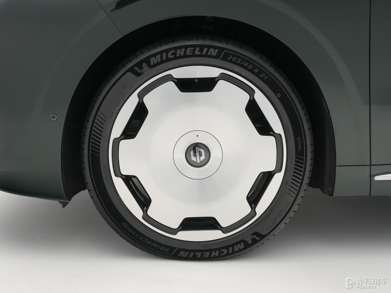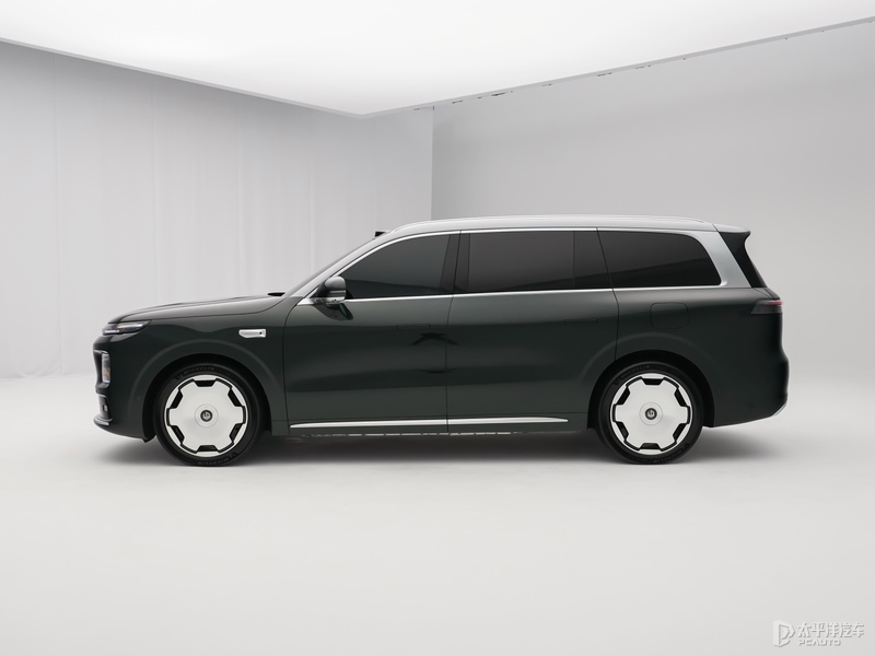车身侧面设计简洁,风格与问界M9、理想L9等车型相似,配备隐藏式车门把手和21英寸密条辐式轮毂或“大饼式”轮毂可选,匹配米其林轮胎(轮毂规格为265/45 R21),整车气场非常强。配色上,新车将会提供松谷绿、液态银、金属黑、天幕灰、光电白共5种颜色可选。