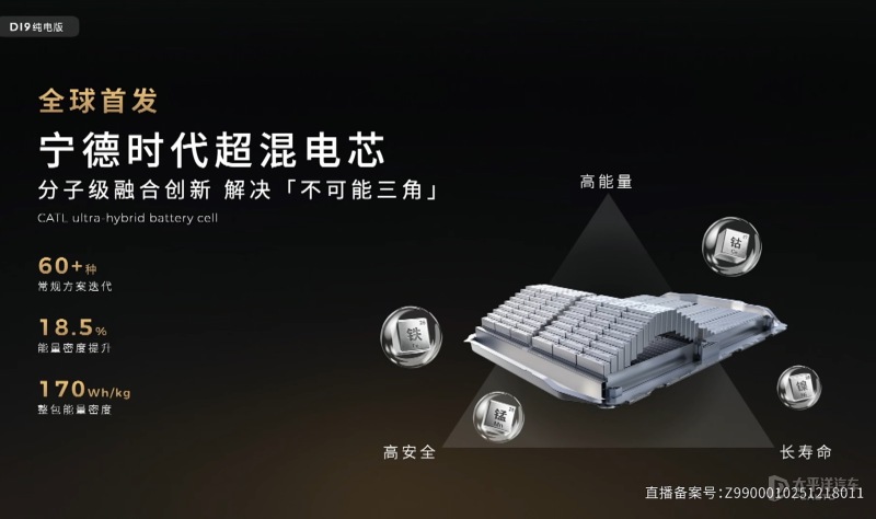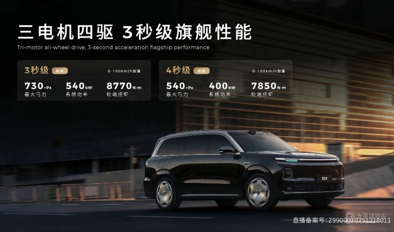 零跑D19纯电版搭载全栈1000V三电系统,系统综合功率540千瓦,百公里加速3秒级,匹配容量为115千瓦时宁德时代电池组,CLTC纯电续航最高720km,最大充电功率460千瓦,充电15分钟补能350km。