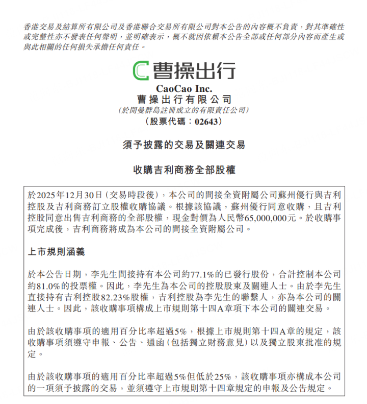 上证报中国证券网讯(记者俞立严)12月30日晚间,在港交所上市的曹操出行宣布两项重要战略收购:收购蔚星科技有限公司(简称“耀出行”)100%股权;拟收购浙江吉利商务服务有限公司(简称“吉利商旅”)100%股权。待两项收购事项分别完成后,耀出行、吉利商旅将成为曹操出行的全资附属公司,此举将进一步升级曹操出行的产品矩阵,打造一站式科技出行平台。